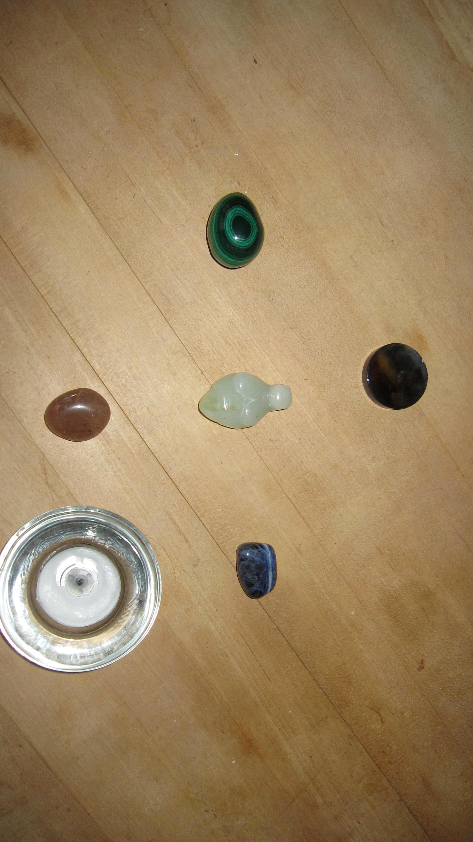4) Once all the stones and the Goddess are in place, put your hand about six or so inches over the stones and move your hand clockwise over the stones seven times clockwise, then seven times counter-clockwise, seven times again clockwise and lastly seven times counter-clockwise. The intention there is to invite the energy/consciousness of the stones to blend with each other in a balanced way. At the end of the four cycles of rotations, pull your hand up bringing the energy up to the Creator/God/Allah. You have just activated the altar. It is good to always go clockwise as you do this, for reasons beyond this teaching.